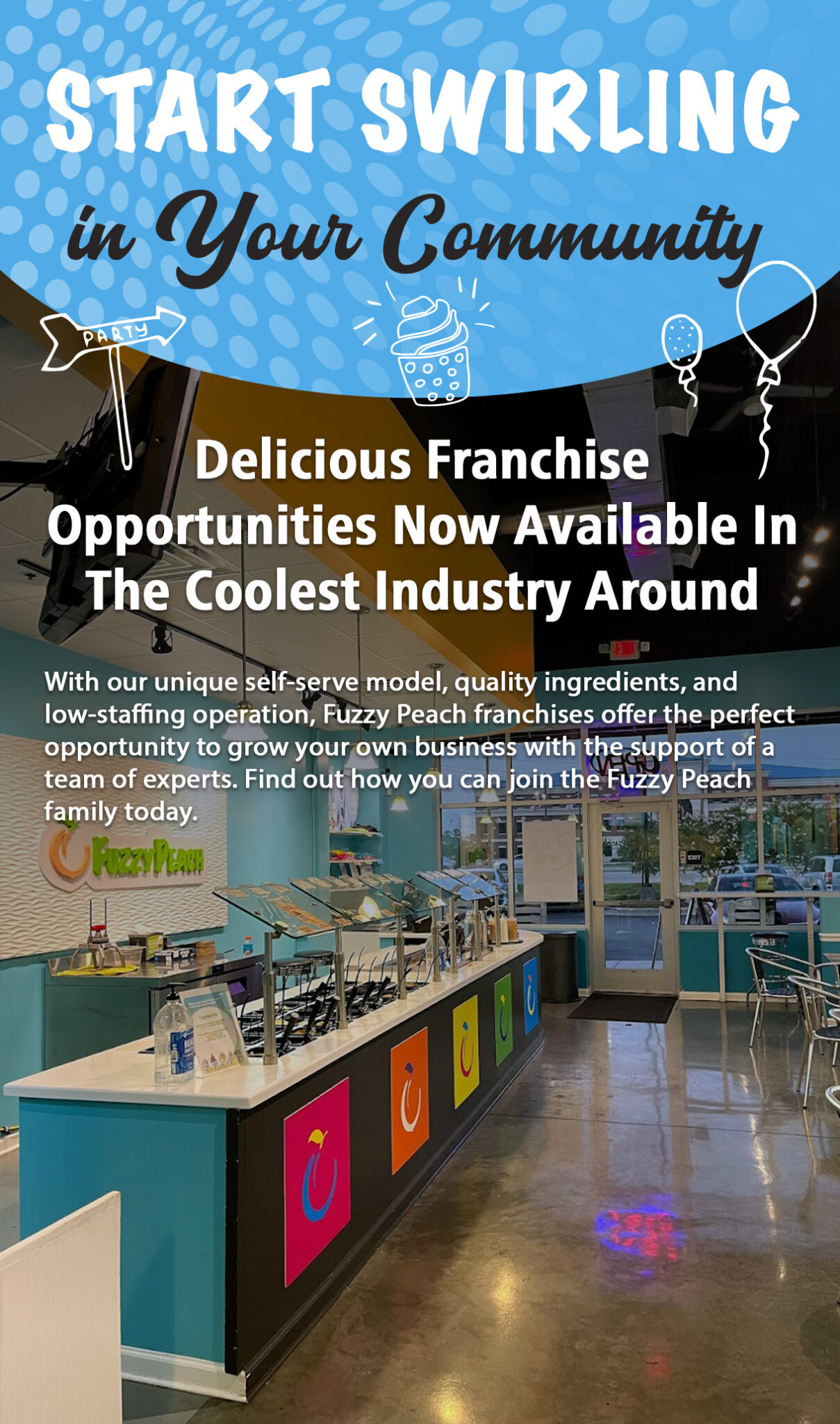 As part of the U-Swirl family today, The Fuzzy Peach retains the charm and personality it was known for; delivering delicious flavors, a vibrant toppings bar, and a fun, easygoing environment where everyone feels at home.”